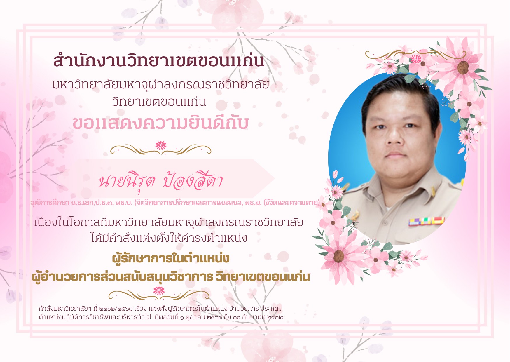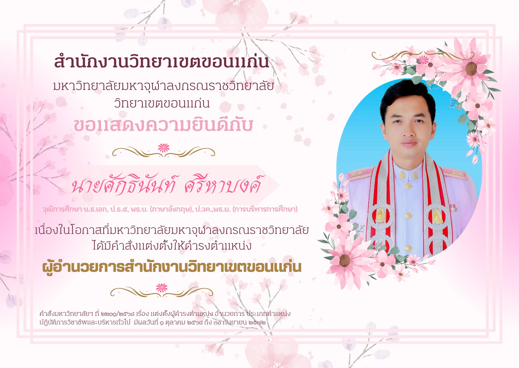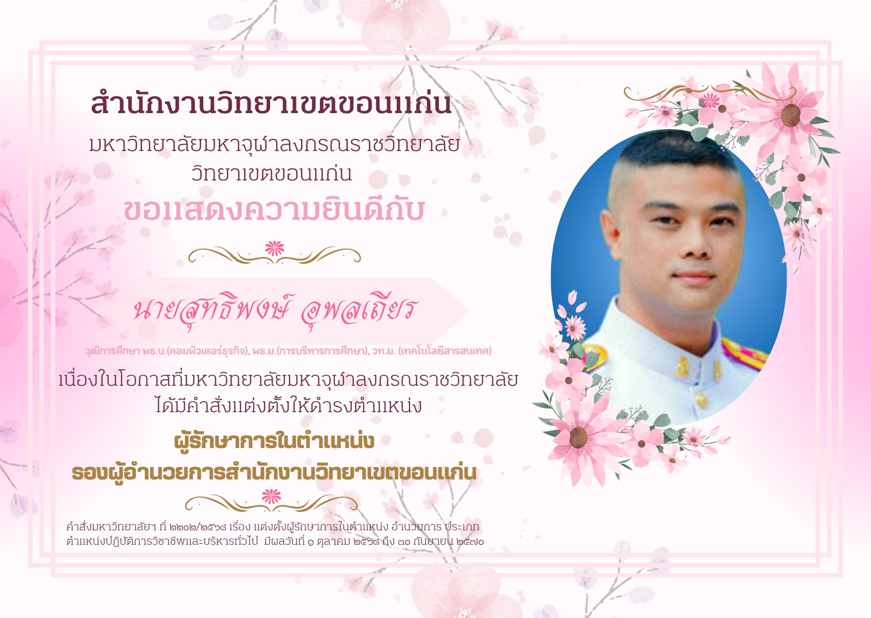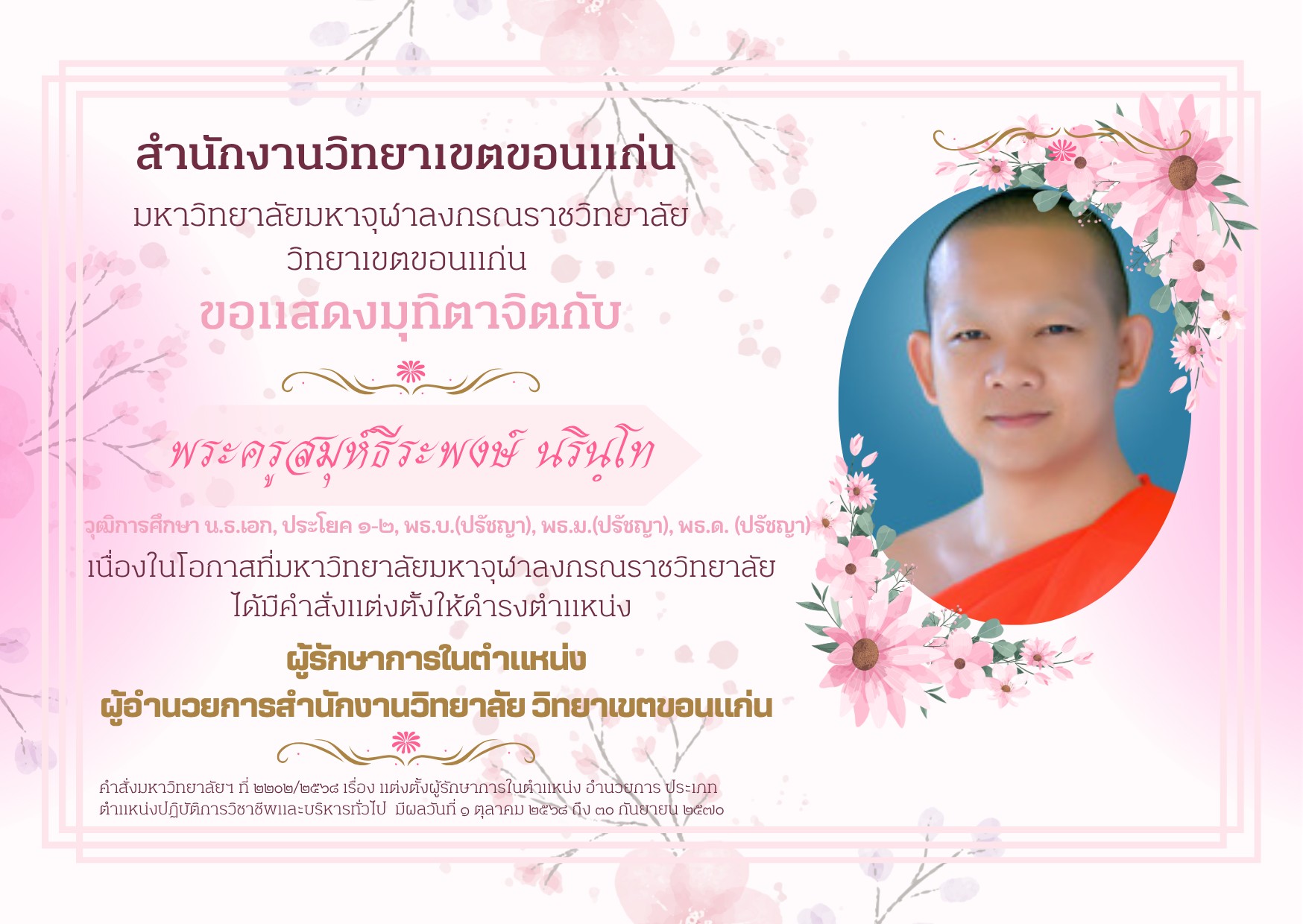เนื่องในโอกาสที่มหาวิทยาลัยมหาจุฬาลงกรณราชวิทยาลัย ได้มีคำสั่งแต่งตั้งให้ดำรงตำแหน่ง ผู้รักษาการในตำแหน่งรองผู้อำนวยการสำนักงานวิทยาเขตขอนแก่น คำสั่งมหาวิทยาลัยฯ ที่ ๒๒๐๒/๒๕๖๘ เรื่อง แต่งตั้งผู้รักษาการในตำแหน่ง อำนวยการ ประเภทตำแหน่งปฏิบัติการวิชาชีพและบริหารทั่วไป มีผลวันที่ ๑ ตุลาคม ๒๕๖๘ ถึง ๓๐ กันยายน ๒๕๗๐