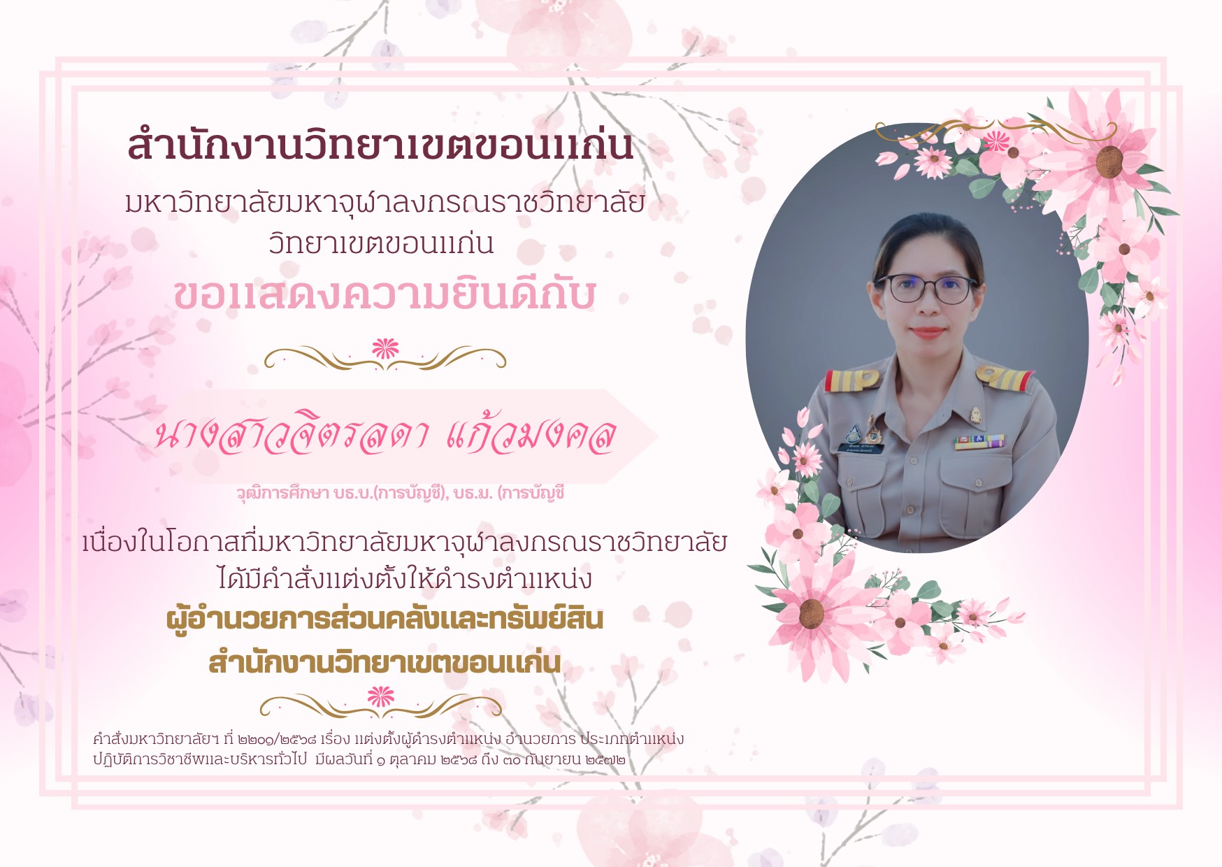 เนื่องในโอกาสที่มหาวิทยาลัยมหาจุฬาลงกรณราชวิทยาลัย ได้มีคำสั่งแต่งตั้งให้ดำรงตำแหน่ง ผู้อำนวยการส่วนคลังและทรัพย์สิน สำนักงานวิทยาเขตขอนแก่น คำสั่งมหาวิทยาลัยฯ ที่ ๒๒๐๑/๒๕๖๘ เรื่อง แต่งตั้งผู้ดำรงตำแหน่ง อำนวยการ ประเภทตำแหน่งปฏิบัติการวิชาชีพและบริหารทั่วไป มีผลวันที่ ๑ ตุลาคม ๒๕๖๘ ถึง ๓๐ กันยายน ๒๕๗๒