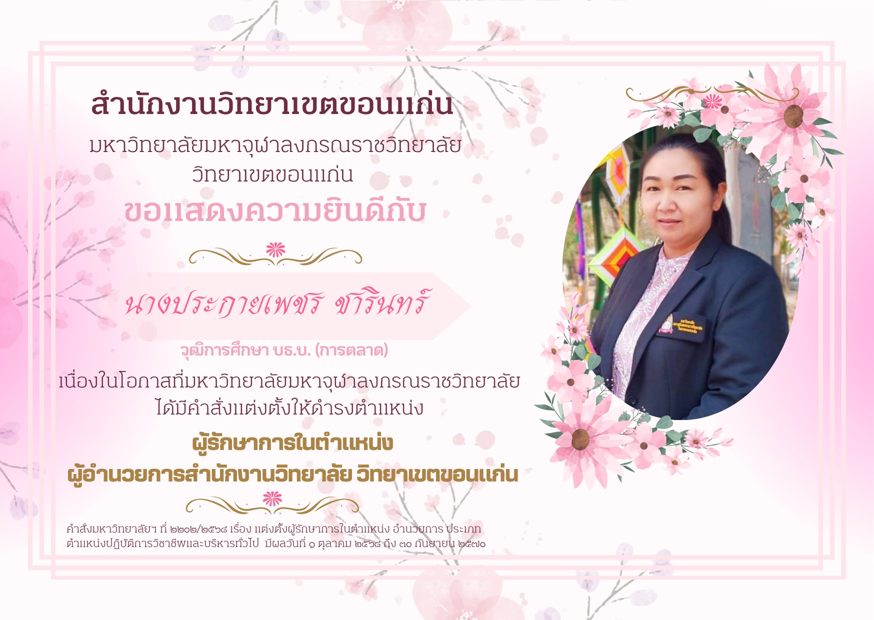เนื่องในโอกาสที่มหาวิทยาลัยมหาจุฬาลงกรณราชวิทยาลัย ได้มีคำสั่งแต่งตั้งให้ดำรงตำแหน่ง ผู้รักษาการในตำแหน่งผู้อำนวยการส่วนสนับสนุนวิชาการ วิทยาเขตขอนแก่น คำสั่งมหาวิทยาลัยฯ ที่ ๒๒๐๒/๒๕๖๘ เรื่อง แต่งตั้งผู้รักษาการในตำแหน่ง อำนวยการ ประเภทตำแหน่งปฏิบัติการวิชาชีพและบริหารทั่วไป มีผลวันที่ ๑ ตุลาคม ๒๕๖๘ ถึง ๓๐ กันยายน ๒๕๗๐
