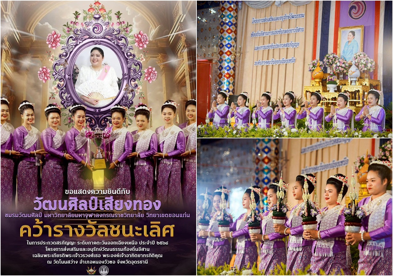 มหาวิทยาลัยมหาจุฬาลงกรณราชวิทยาลัย วิทยาเขตขอนแก่น ขอแสดงความยินดีกับ คณะนิสิตระดับปริญญาตรีจากชมรมวัฒนศิลป์ มจร.วิทยาเขตขอนแก่น ที่ได้รับรางวัลชนะเลิศ การประกวดสรภัญญะ ระดับภาคตะวันออกเฉียงเหนือ ประจำปี ๒๕๖๘ โครงการส่งเสริมและอนุรักษ์วัฒนธรรมท้องถิ่นอีสาน เฉลิมพระเกียรติพระเจ้าวรวงศ์เธอ พระองค์เจ้าอาทิตยาทรกิติคุณ ณ วัดโนนสว่าง อำเภอหนองวัวซอ จังหวัดอุดรธานี เมื่อวันที่ ๗ ตุลาคม ๒๕๖๙