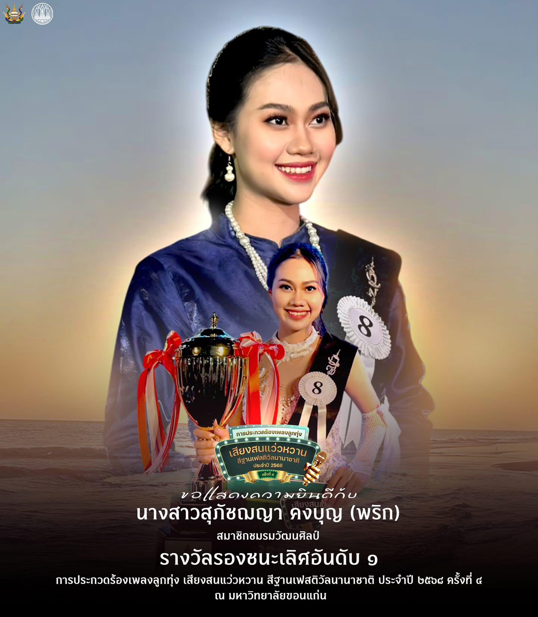 เมื่อวันที่ ๔ พฤศจิกายน ๒๕๖๘ มหาวิทยาลัยมหาจุฬาลงกรณราชวิทยาลัย วิทยาเขตขอนแก่น ขอแสดงความยินดีกับ “นางสาวสุภัชฌญา คงบุญ (พริก)” นิสิตระดับปริญญาตรี ชั้นปีที่ ๑ สาขาการสอนภาษาไทย และสมาชิกชมรมวัฒนศิลป์ ในโอกาสได้รับรางวัลรองชนะเลิศอันดับ ๑ การประกวดร้องเพลงลูกทุ่ง (ประเภทหญิง) เสียงสนแว่วหวาน สีฐานเฟสติวัลนานาชาติ ประจำปี ๒๕๖๘ ครั้งที่ ๔ ณ มหาวิทยาลัยขอนแก่น