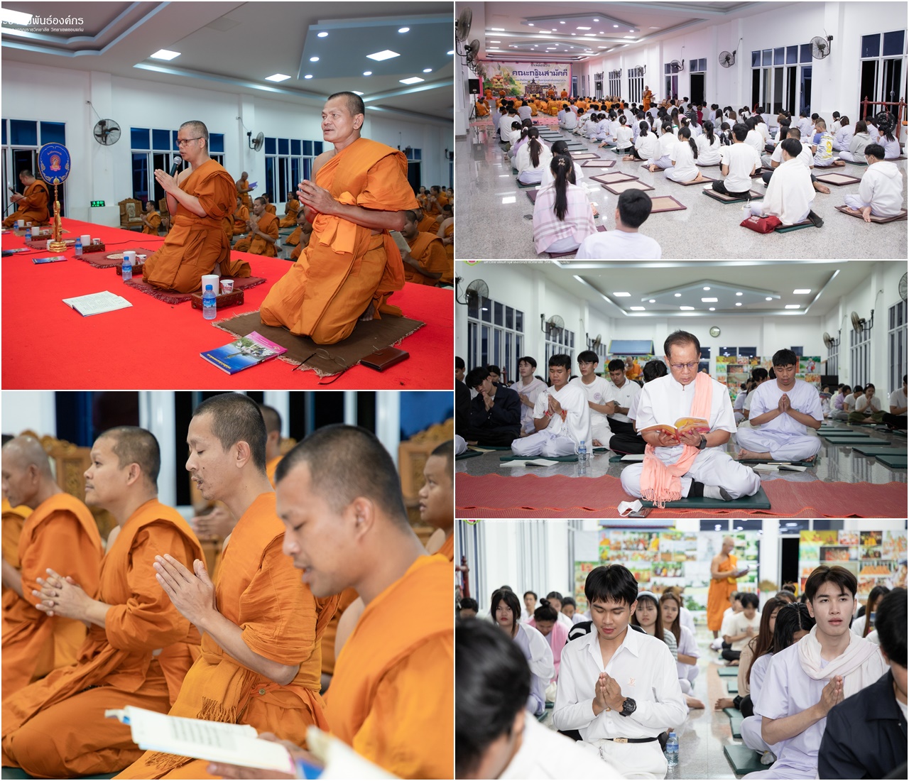 โดยมี พระครูปลัดบุญช่วย โชติวํโส, ดร. เป็นประธานนำกล่าวคำบูชาพระรัตนตรัยและนำสวดมนต์ พร้อมด้วยคณะพระวิปัสสนาจารย์ ร่วมกับกลุ่มนิสิตที่เข้าอบรมปฏิบัติธรรม ในโครงการปฏิบัติวิปัสสนากัมมัฏฐานนิสิต ประจำปีการศึกษา 2568