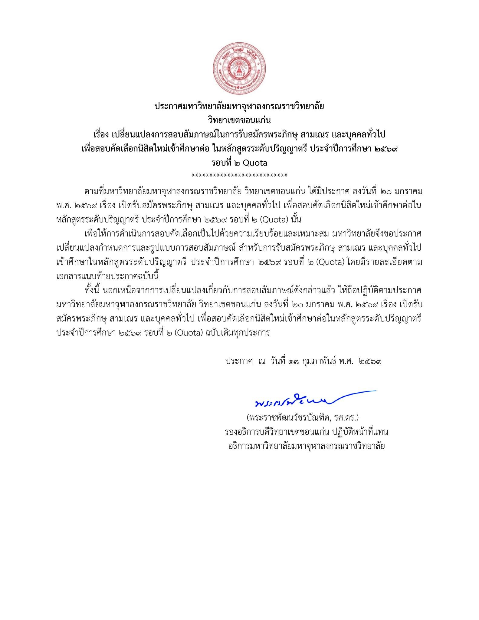 เรื่อง เปลี่ยนแปลงกำหนดการสอบสัมภาษณ์ในการรับสมัครพระภิกษุสามเณร และบุคคลทั่วไป เพื่อสอบคัดเลือกนิสิตใหม่เข้าศึกษาต่อ ในหลักสูตรระดับปริญญาตรี ประจำปีการศึกษา 2569 รอบที่ 2 (Quota)