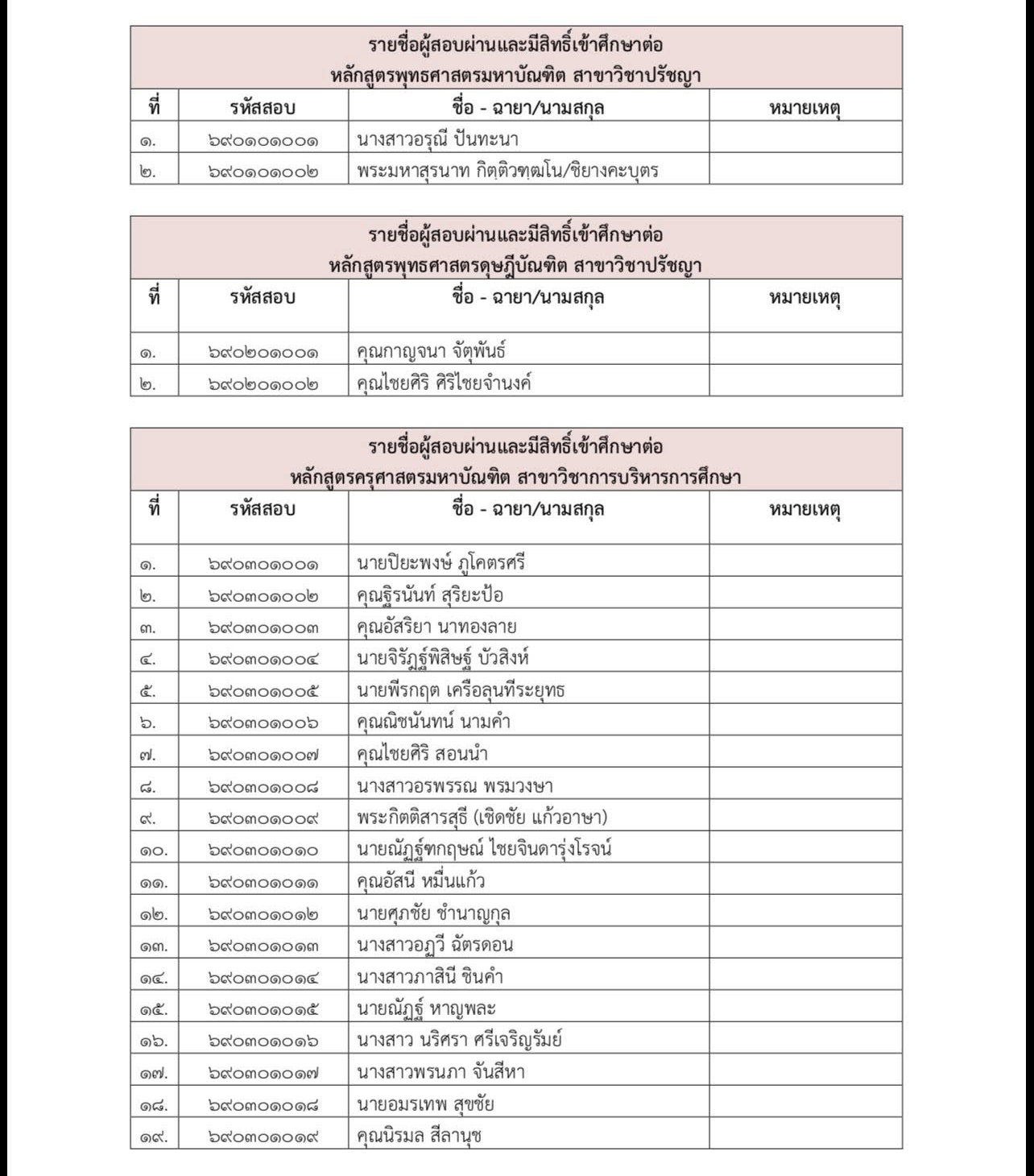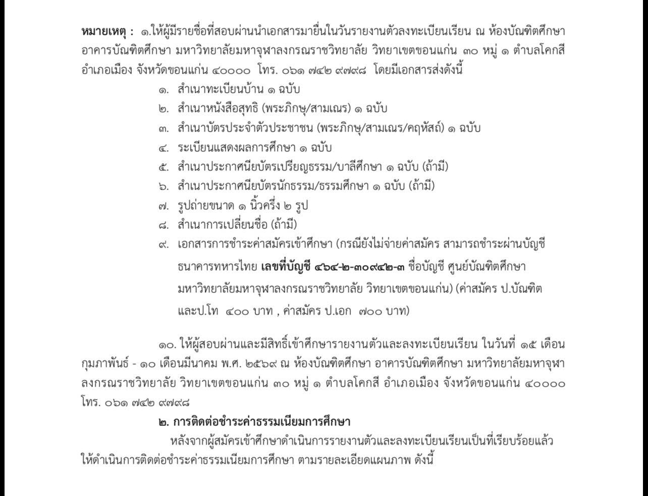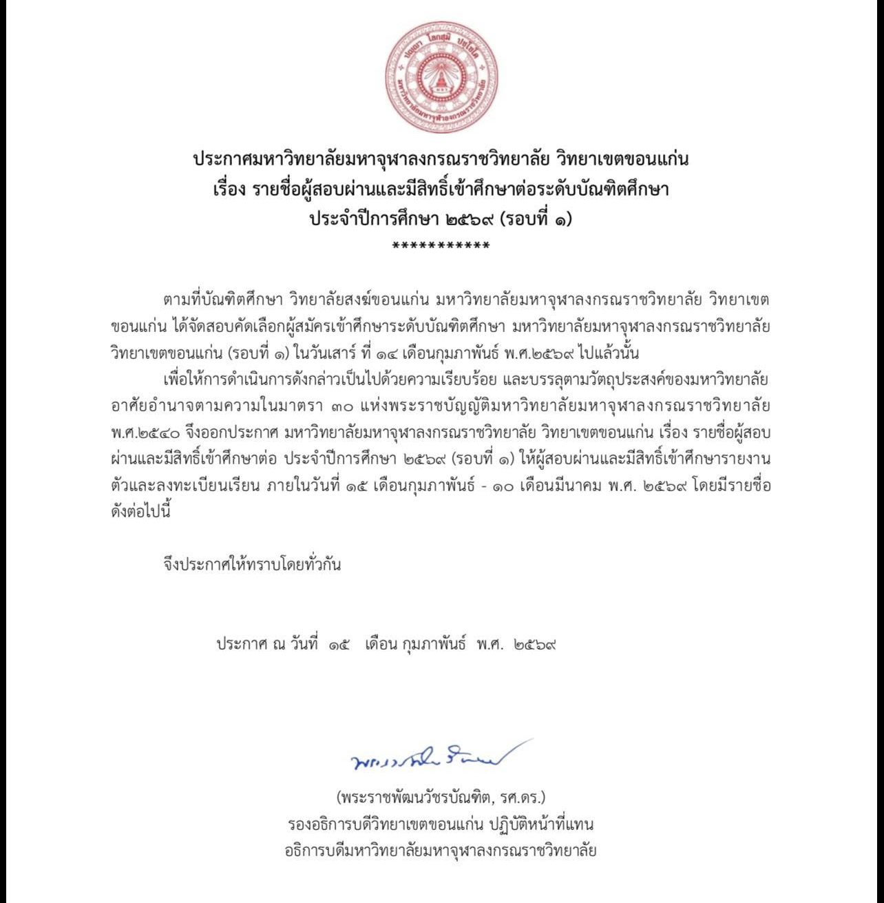 มหาวิทยาลัยมหาจุฬาลงกรณราชวิทยาลัย วิทยาเขตขอนแก่น ประกาศรายชื่อผู้สอบผ่านและมีสิทธิ์เข้าศึกษาต่อหลักสูตรระดับบัณฑิตศึกษา ประจำปีการศึกษา 2569 (รอบที่ 1)