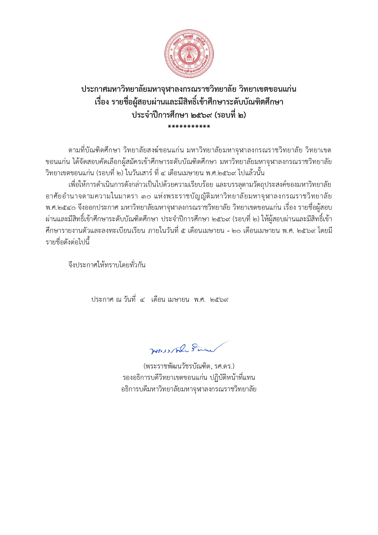 บัณฑิตศึกษา มหาวิทยาลัยมหาจุฬาลงกรณราชวิทยาลัย วิทยาเขตขอนแก่น ขอแสดงความยินดีกับผู้ที่ผ่านการสอบคัดเลือกและมีสิทธิ์เข้าศึกษาระดับบัณฑิตศึกษา ประจำปีการศึกษา 2569 (รอบที่ 2) ทุกท่านครับ