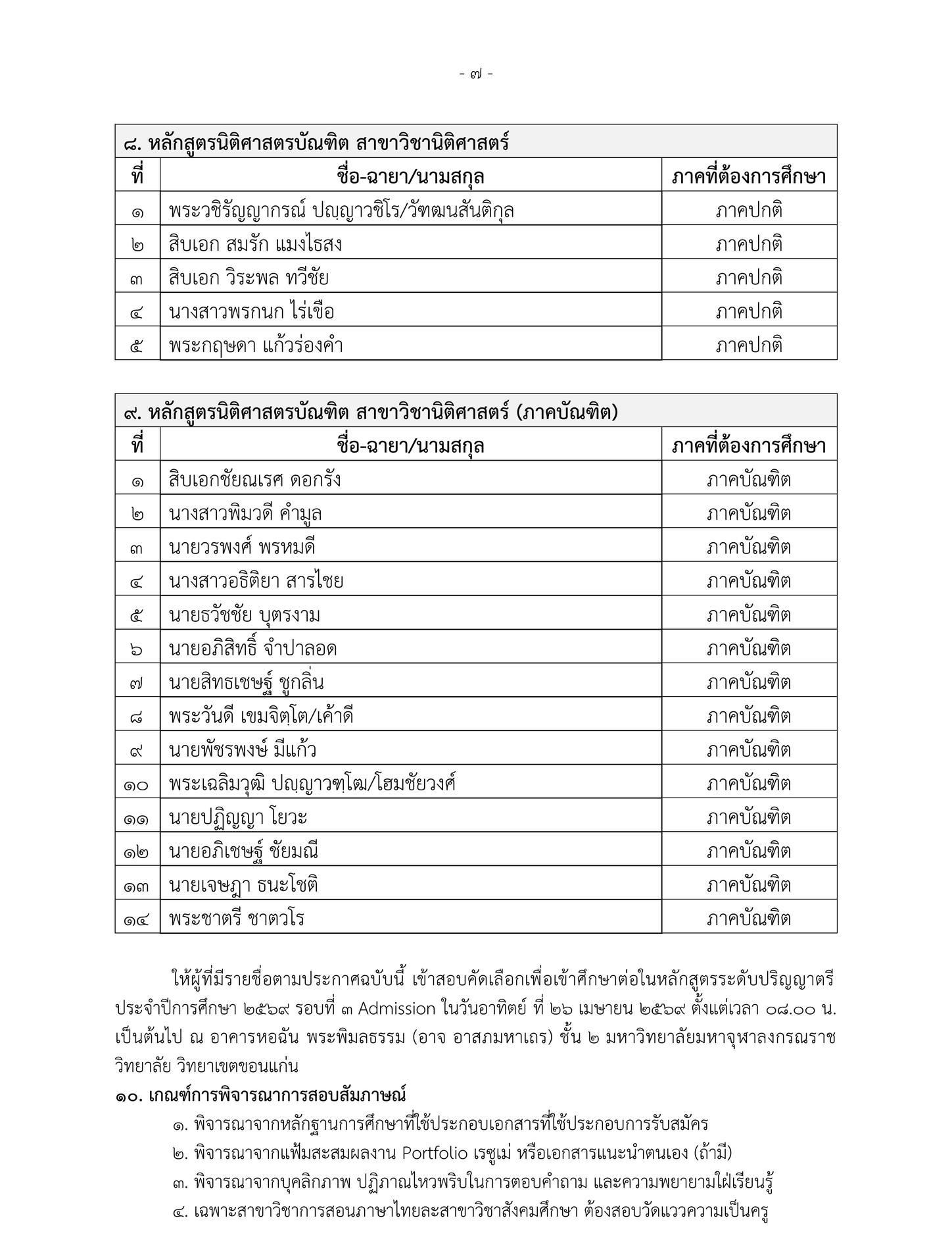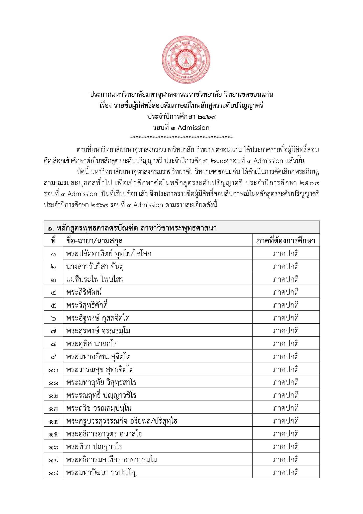 ประกาศรายชื่อผู้มีสิทธิ์สอบคัดเลือก รอบที่ 3 (Admission) ประจำปีการศึกษา 2569 มหาวิทยาลัยมหาจุฬาลงกรณราชวิทยาลัย วิทยาเขตขอนแก่น